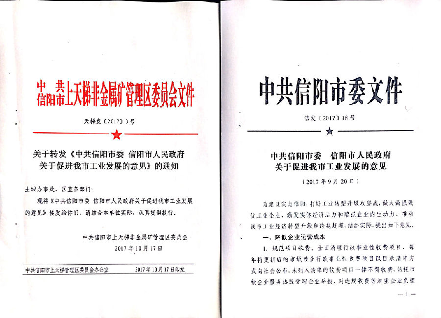 天梯发〔2017〕3号 关于转发《中共信阳市委 信阳市人民政府关于促进我市工业发展的意见》的通知