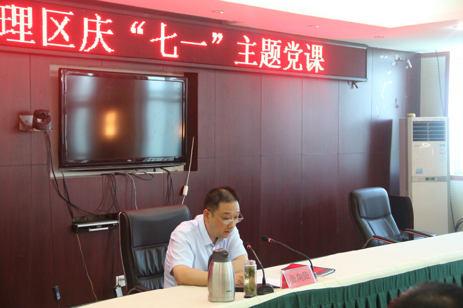 为庆祝中国共产党成立97周年,6月29日下午,区党委书记、主任张向阳同志围绕“不忘初心 牢记使命 做‘五个过硬’的党员干部”这一主题,为管理区党员干部上了一堂生动的党课。会议由区党委委员、纪委书记毛鹏程同志主持,全区科级以上干部、垂直部门负责同志共计60余人参加了会议。